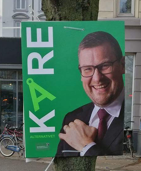 Som rosinen i pølseenden kommer Alternativet, der endnu engang har hittet på det mest visuelt originale og det mest ... øhh. Jeg ved ikke hvad jeg skal kalde Kåre. Hvor Alternativets selvlysende håb-plakat er fremragende tænkt, er Kåres plakat bare grænsende til træls. Hvad griner an af? Hvorfor står han sådan med sin hånd? Vil han vise mig, at han er gift? ("Desværre piger!") Hvorfor minder han om Lars Von Trier? Så mange ubesvarede spørgsmål.