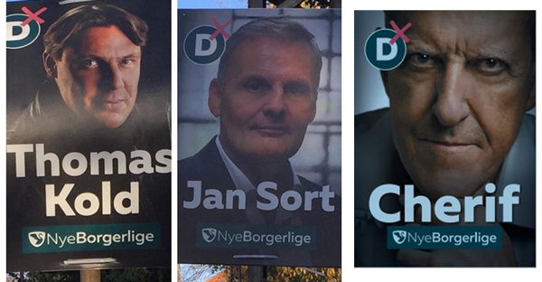 Fra farvelade til den dybeste, sorte sort, som vi finder på Nye Borgerliges plakater. Men for et parti der vil have Danmark ud af EU og flygtninge ud af Danmark, og generelt bare lukke dørene for alt og alle, kan man næppe finde en bedre kulør. Eller bedre efternavne til deres kandidater.