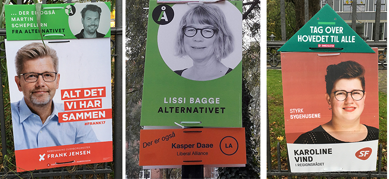 De tegnede plakater er populære på begge fløje. Alternativets Niko Grünfeld har en karikatur af sig selv der ligner, at han selfier sig selv oppefra. Som plakat er den ikke specielt effektiv, da hans krop fylder ligeså meget som hans hovede, plads der kunne være brugt til at vise hvad han står for. Se bare Marcus Vesterager fra Socialdemokratiet, som bruger sin plakat til at vise vindmøller og træer – ved nærmere eftersyn. Først så jeg røgspyttende skorstene over byens tage, og det er næppe hvad Vesterager vil have mig til at tænke. Portrættet er desuden digitalt tracet og plakaten har ikke samme tegnestil på alle elementer. Det er synd, for det er en god ide at vise hvad man står for visuelt i stedet for med ord. (Og så mangler der altså lidt rød!)